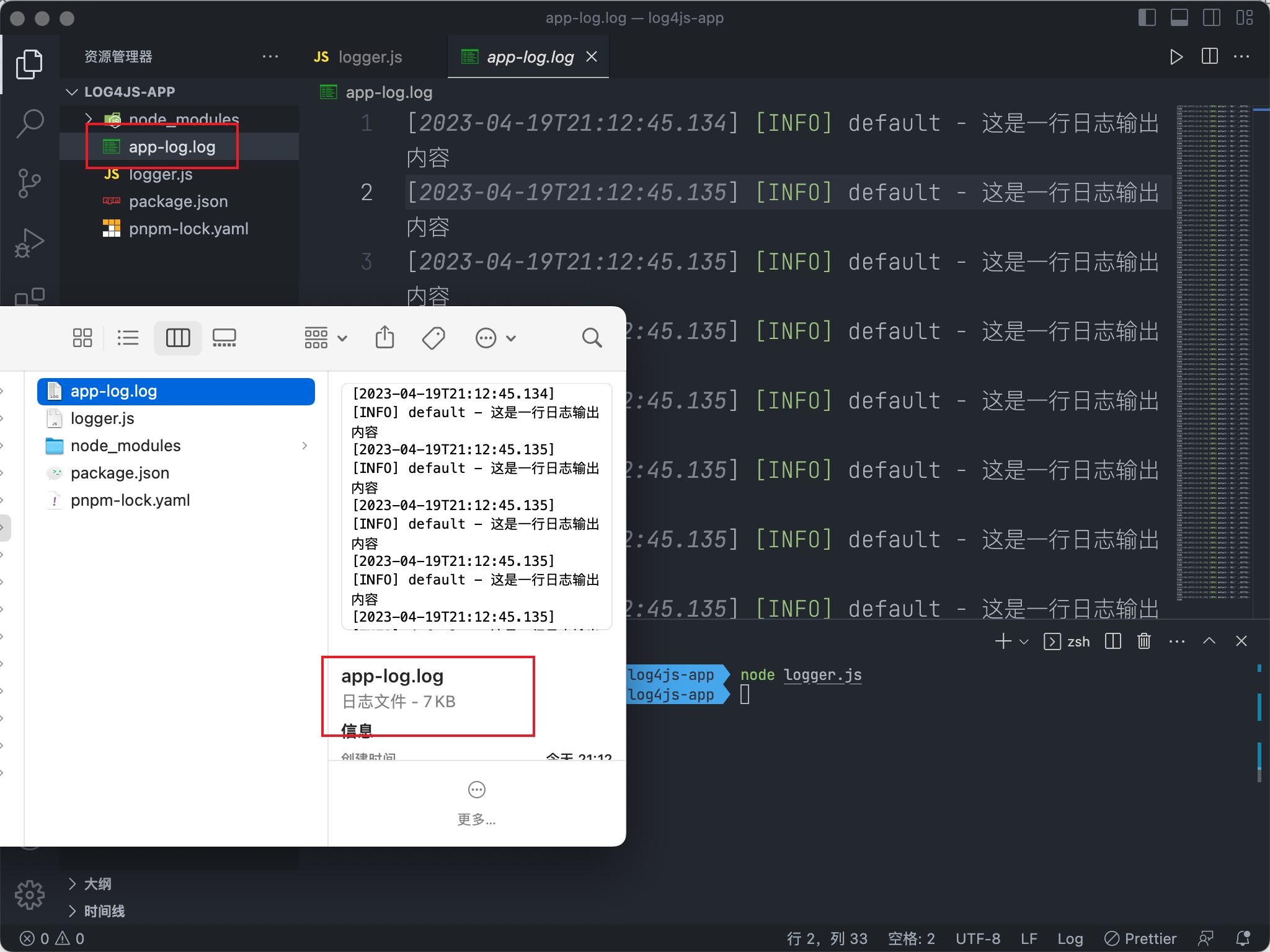 执行一次代码,可以发现app-log.log文件已经被创建了,大小为7kb,写入内容如下: